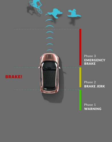 Der Fiat 500 Elektro bremst automatisch ab, um Kollisionen mit vorausfahrenden Fahrzeugen, Fußgängern oder Radfahrern bis zu 130 km/h zu vermeiden. Zunächst warnt das Fahrzeug mit einem akustischen und optischen Signal. Reagiert der Fahrer nicht, bremst das Fahrzeug ab und hilft dem Fahrer einen möglichen Aufprall zu verhindern oder abzuschwächen.